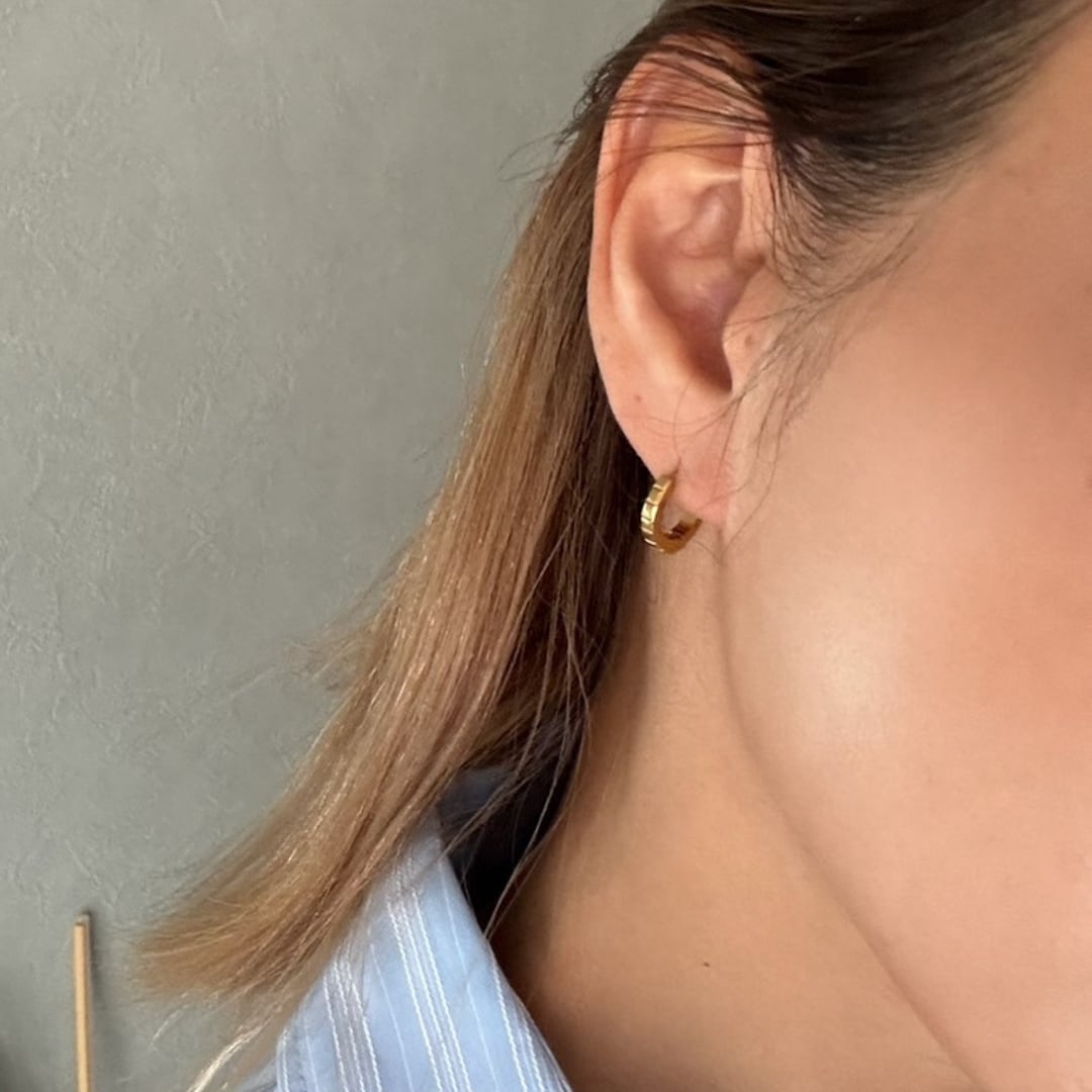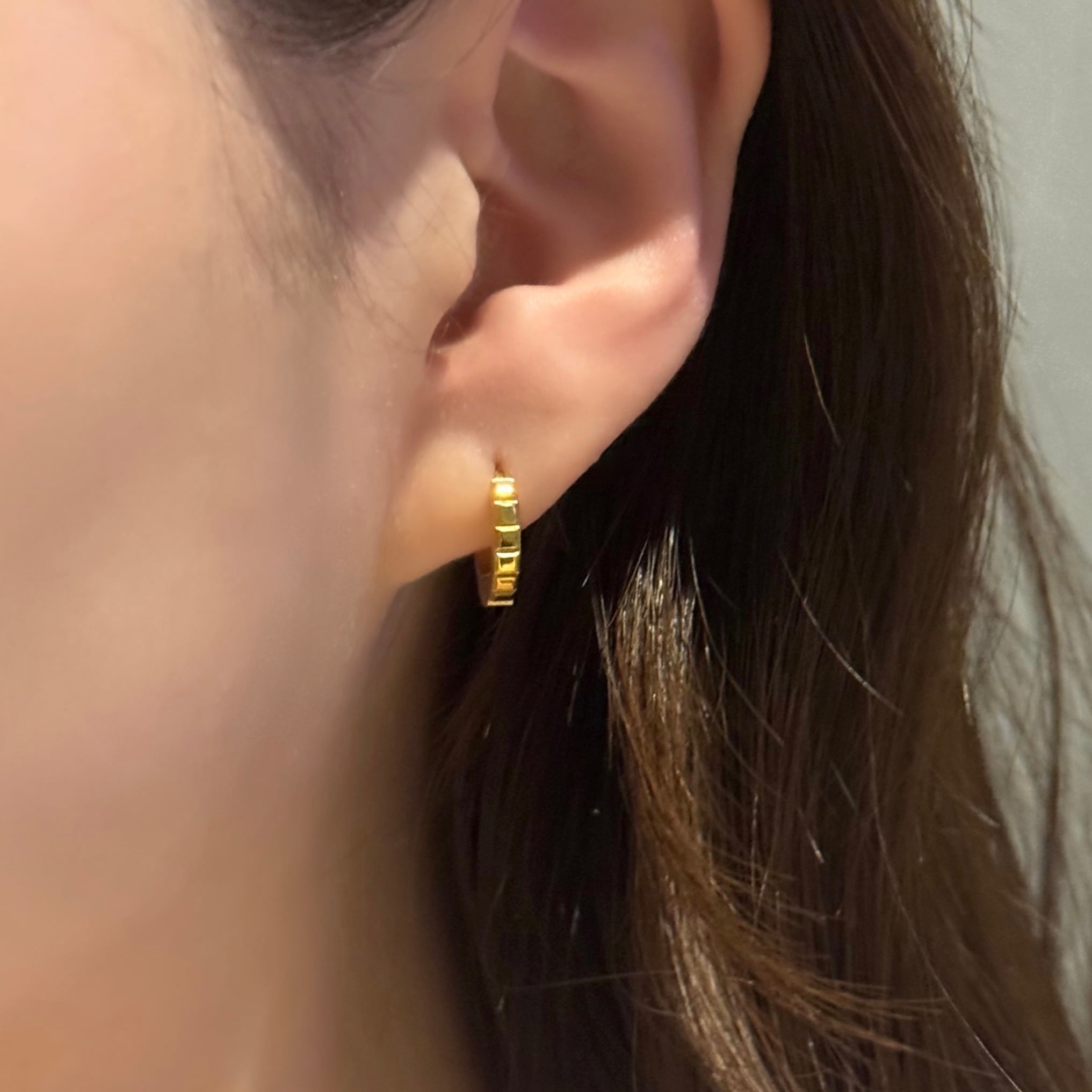 立体感のあるモダンなデザインが特徴のゴールドフープピアス。シンプルながら存在感のあるフォルムで、耳元を上品に彩る。カジュアルからフォーマルまで幅広いシーンで活躍する万能アイテム。